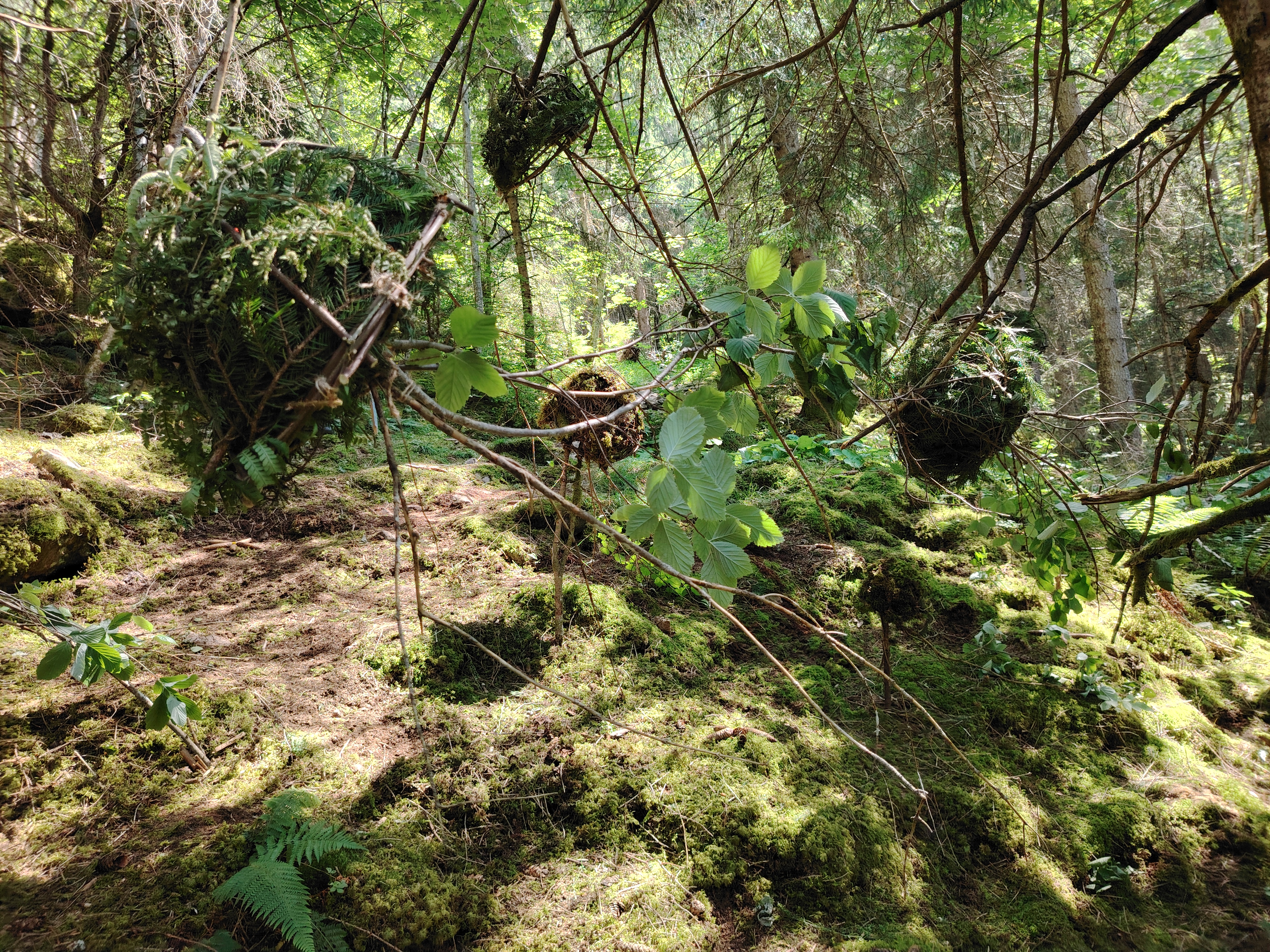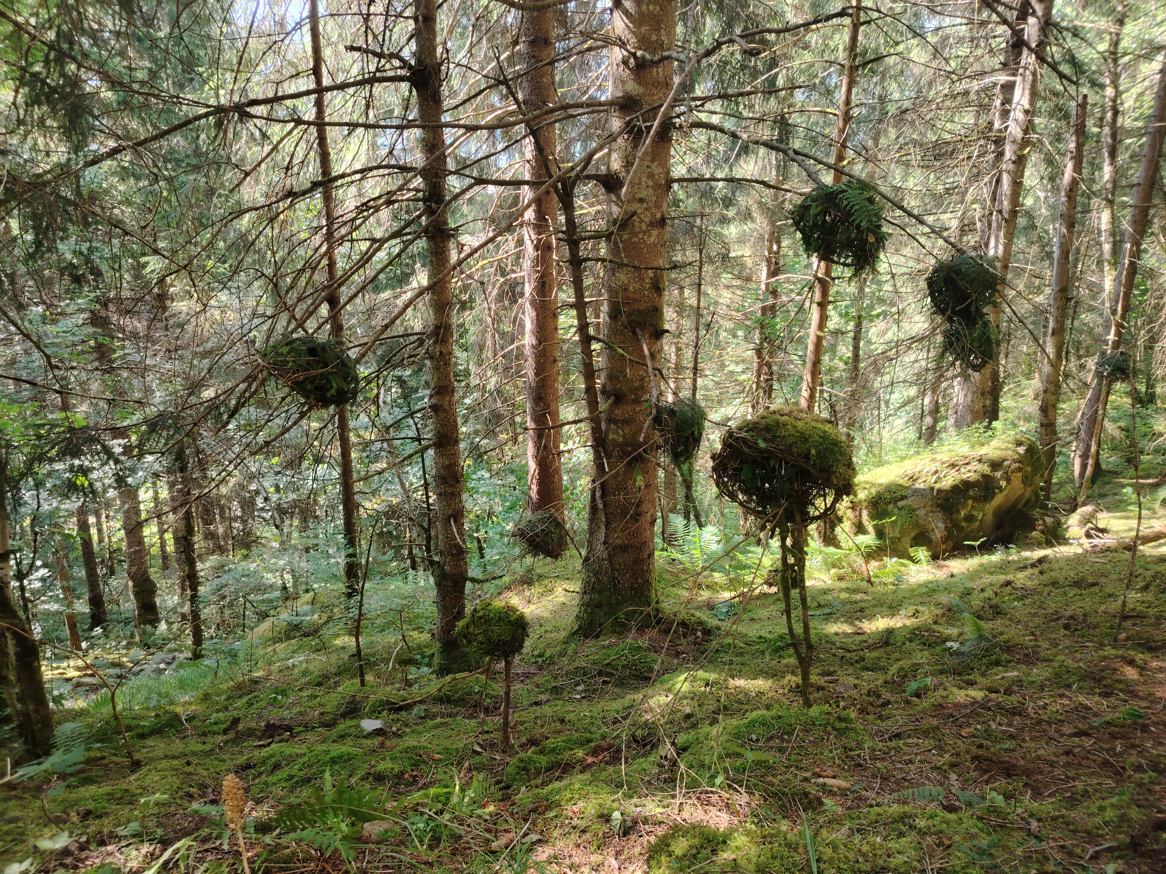 La instalación Mountain Jellyfish interviene en el paisaje natural de Grindelwald, un entorno dominado por imponentes montañas y antiguos glaciares que un día descansaron bajo el mar. Inspiradas en esta memoria geológica, las piezas evocan medusas suspendidas en el bosque, transformando el espacio en un fondo marino: seres del océano que regresan fugazmente al lugar que fue suyo.